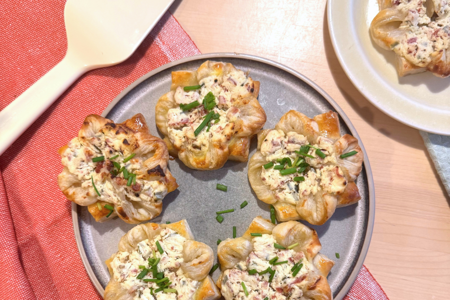 Tee ensin täyte. Sekoita Creme Fraiche, ruohosipulituorejuusto, Napolin salamirouhe, ruohosipuli sekä mausteet. Maista ja mausta oman maun mukaan. Taittele joulutortut haluamaasi muotoon ja lisää täyte. Voitele kananmunalla ja paista 225 astetta noin 8-15 minuuttia. Lisää päälle halutessasi vielä ruohosipulia. Maista ja ihastu!